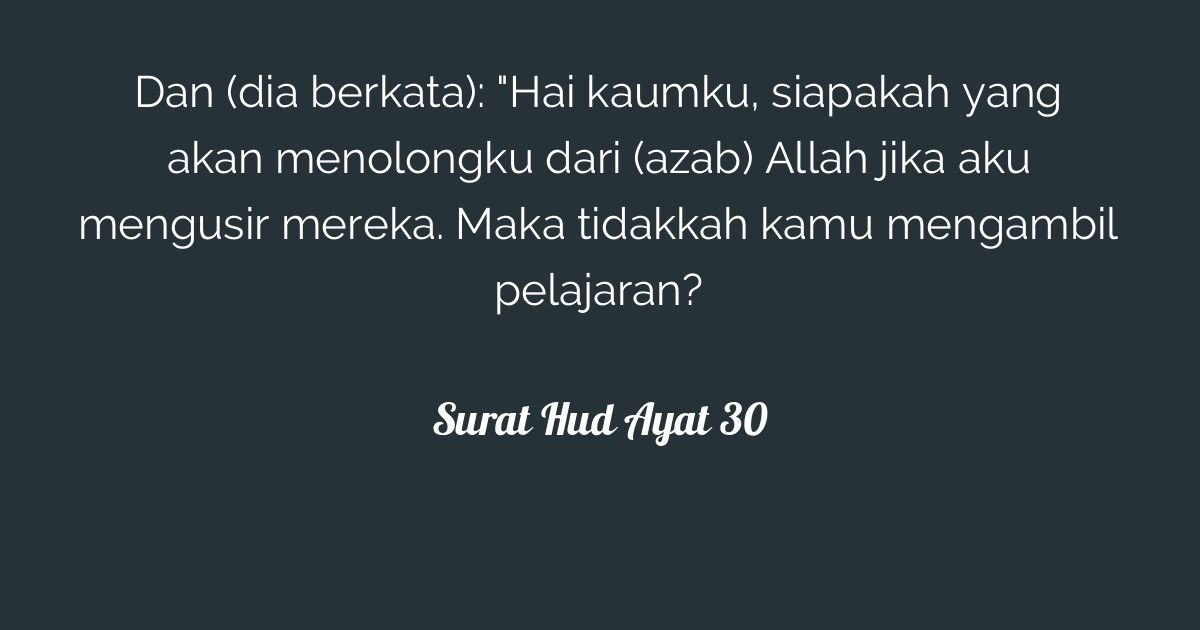 Surat Hud 21-30 - Surah Yunus ayat 40 QS. 10:40 » Tafsir Alquran (Surah : Surat hud ayat 30 وَيَا قَوْمِ مَنْ يَنْصُرُنِي مِنَ اللَّهِ إِنْ طَرَدْتُهُمْ ۚ أَفَلَا تَذَكَّرُونَ dan (dia berkata):. Surat hud ayat 30 وَيَا قَوْمِ مَنْ يَنْصُرُنِي مِنَ اللَّهِ إِنْ طَرَدْتُهُمْ ۚ أَفَلَا تَذَكَّرُونَ dan (dia berkata): Have those who disbelieved not considered that the heavens and the earth were a joined entity, and we separated them and made from water every living thing? أُو۟لَٰٓئِكَ ٱلَّذِينَ خَسِرُوٓا۟ أَنفُسَهُمْ وَضَلَّ عَنْهُم مَّا كَانُوا۟ يَفْتَرُونَ. This is a portion of the entire surah. Hai kaumku, siapakah yang akan menolongku dari …